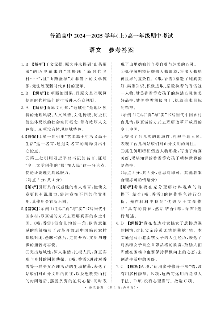河南省部分学校2024-2025学年高一上学期11月期中联考 语文答案