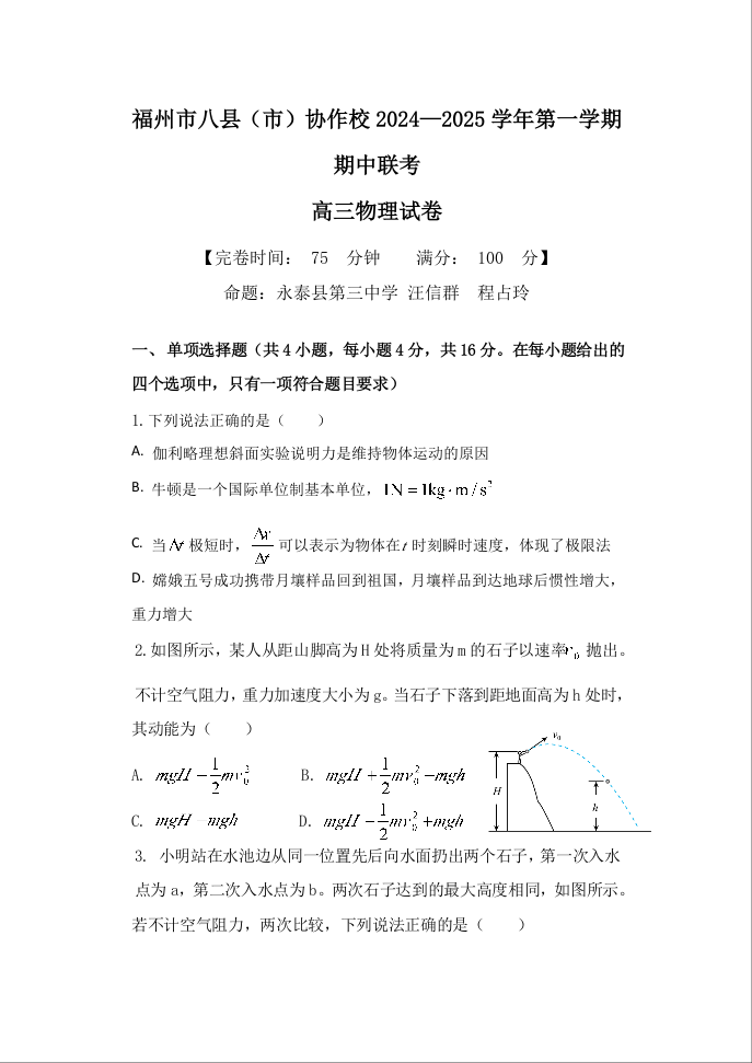 福建省福州市八县(市)协作校2024-2025学年高三上学期期中联考试题 物理