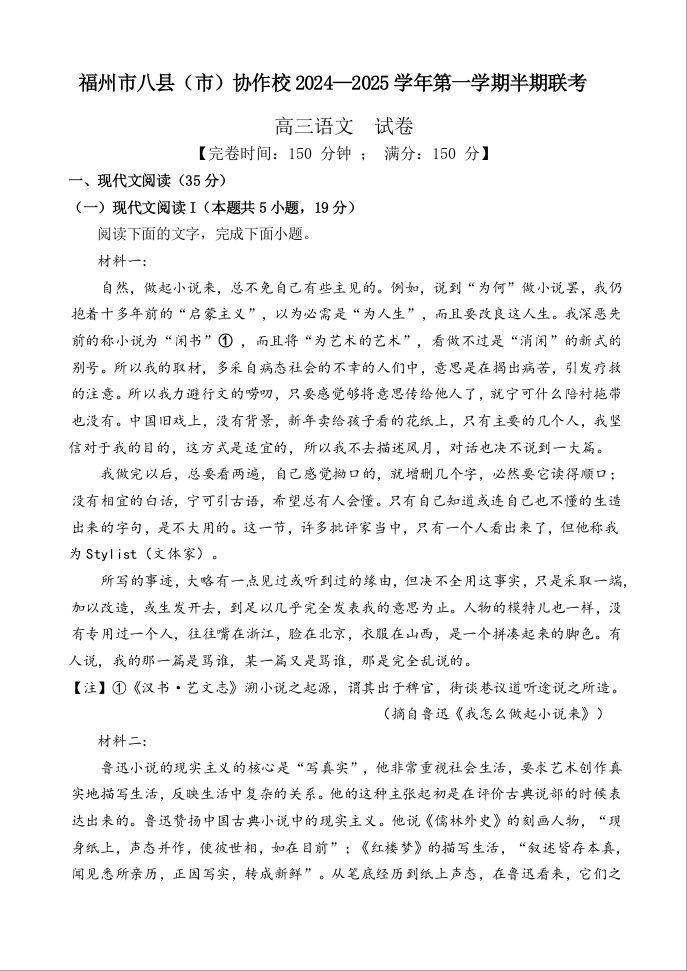 福建省福州市八县(市)协作校2024-2025学年高三上学期期中联考试题 语文