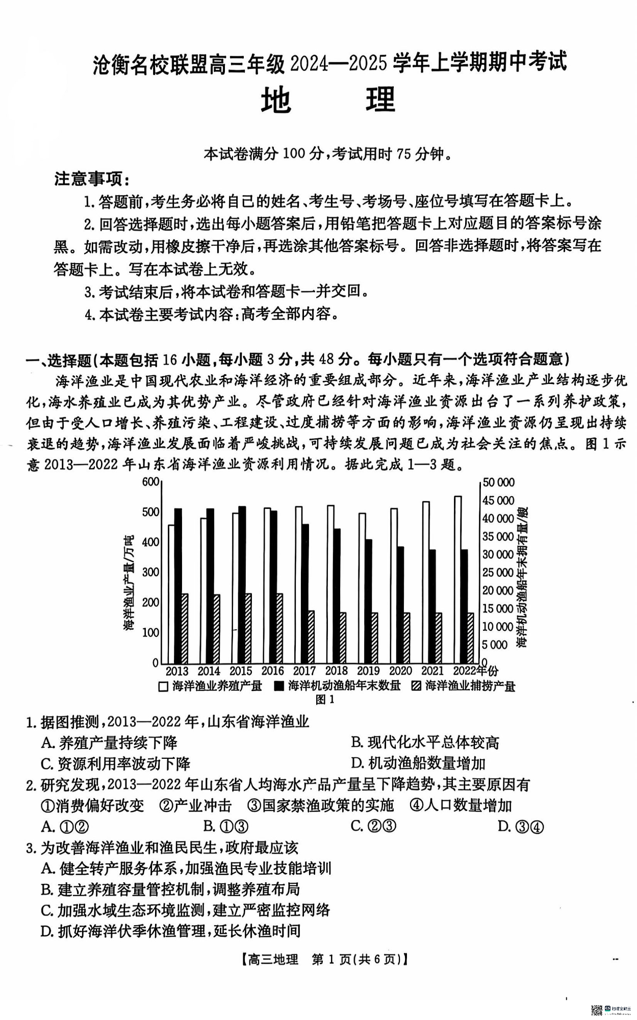 河北省沧衡名校联盟2024-2025学年高三11月期中考试 地理