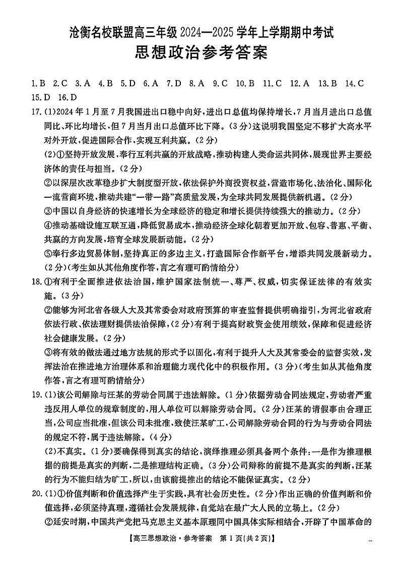 河北省沧衡名校联盟2024-2025学年高三11月期中考试 政治答案
