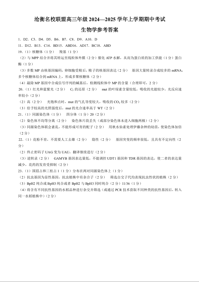 河北省沧衡名校联盟2024-2025学年高三11月期中考试 生物答案
