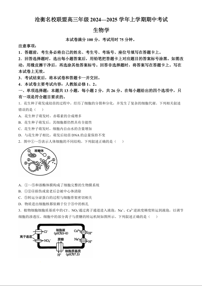 河北省沧衡名校联盟2024-2025学年高三11月期中考试 生物