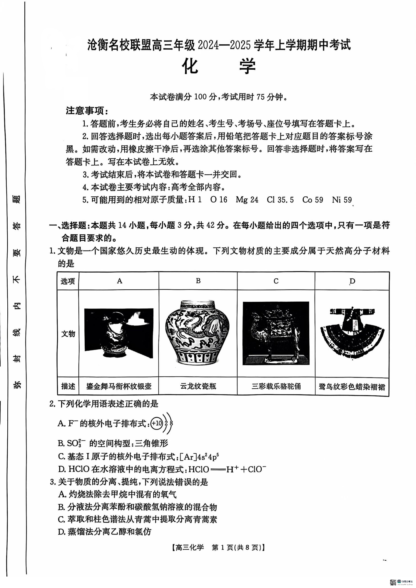 河北省沧衡名校联盟2024-2025学年高三11月期中考试 化学