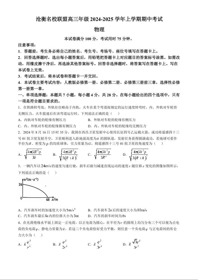 河北省沧衡名校联盟2024-2025学年高三11月期中考试 物理
