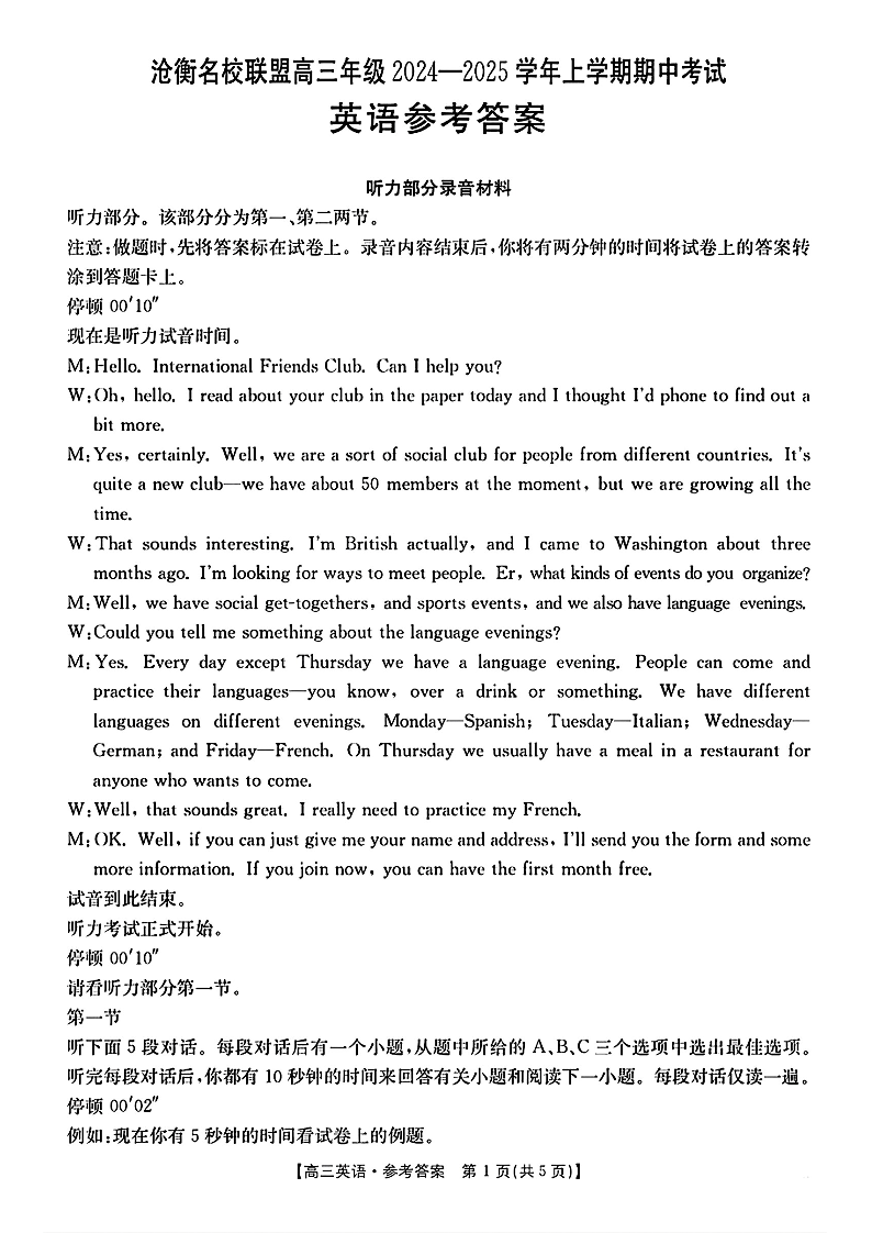 河北省沧衡名校联盟2024-2025学年高三11月期中考试 英语答案
