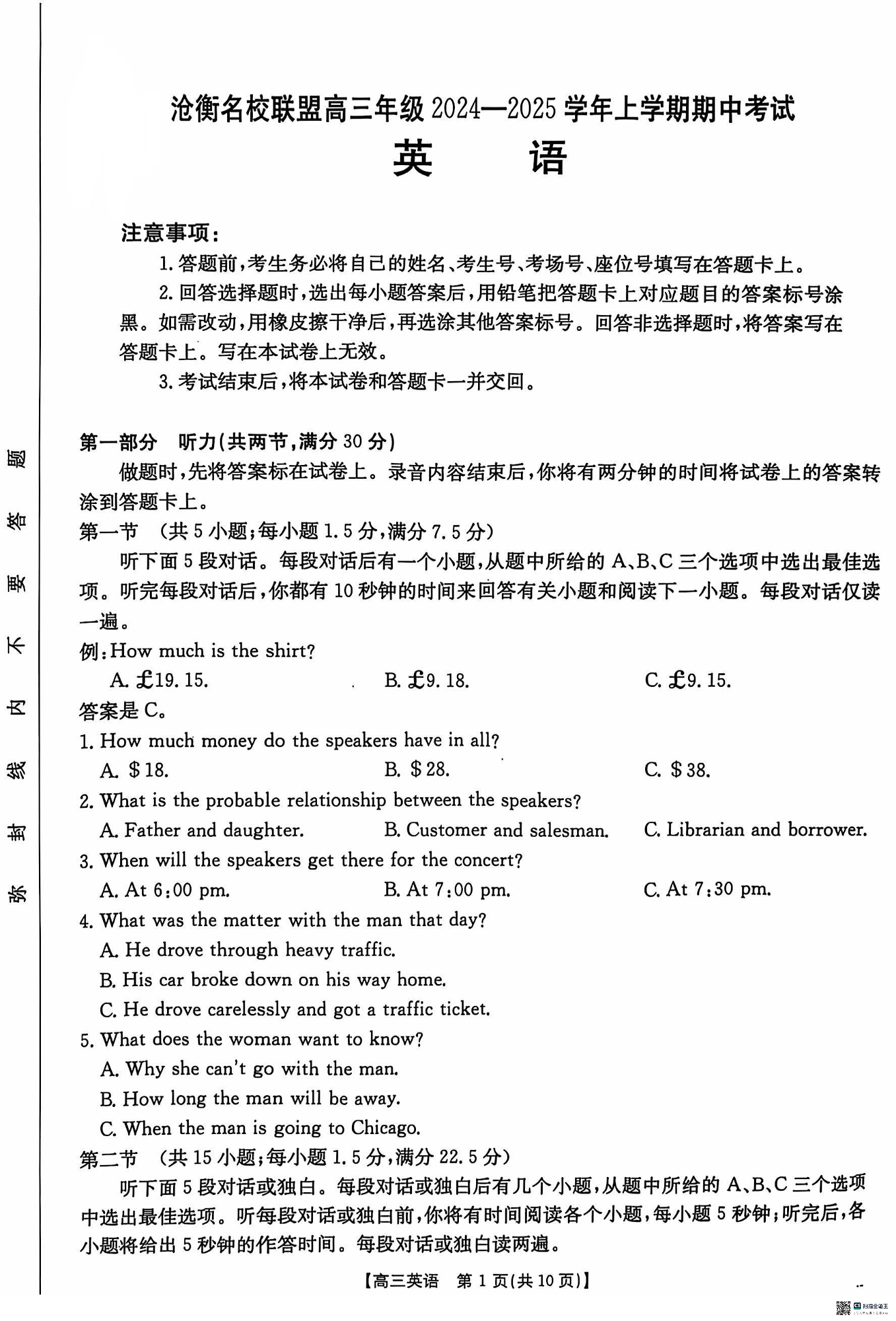 河北省沧衡名校联盟2024-2025学年高三11月期中考试 英语