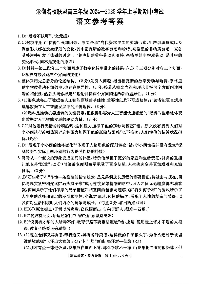 河北省沧衡名校联盟2024-2025学年高三11月期中考试 语文答案
