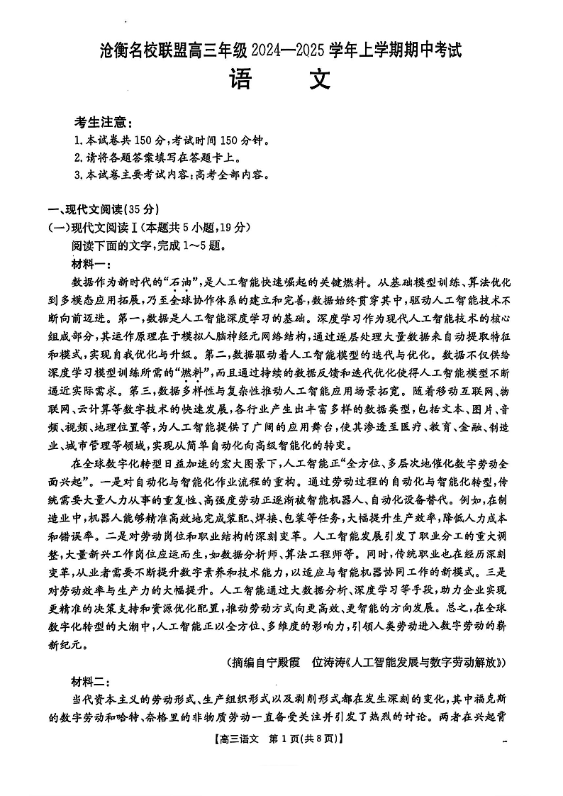 河北省沧衡名校联盟2024-2025学年高三11月期中考试 语文