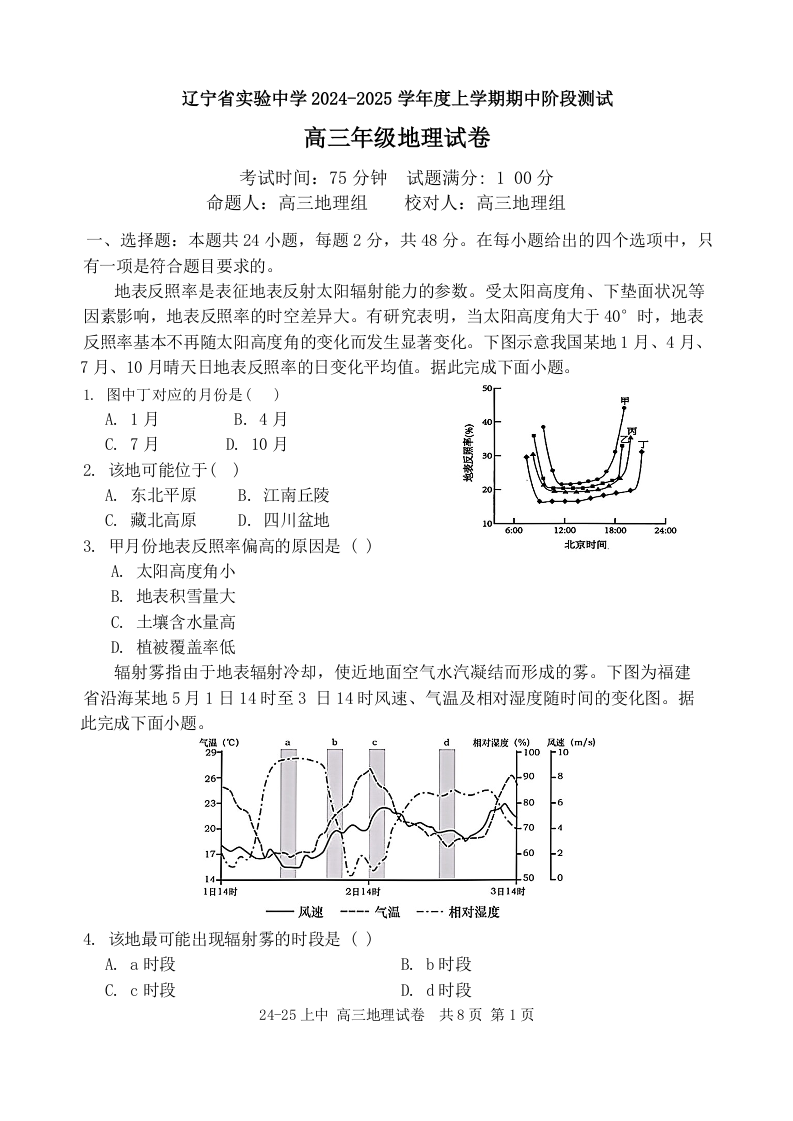 辽宁省实验中学2024-2025学年度高三上学期期中阶段测试 地理