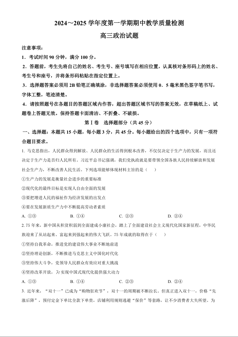 山东省济宁市2024-2025学年高三上学期期中考试 政治