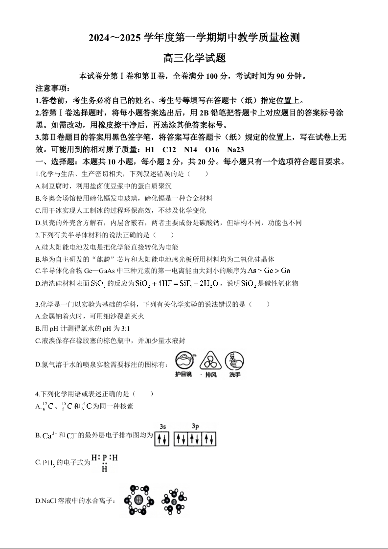 山东省济宁市2024-2025学年高三上学期期中考试 化学
