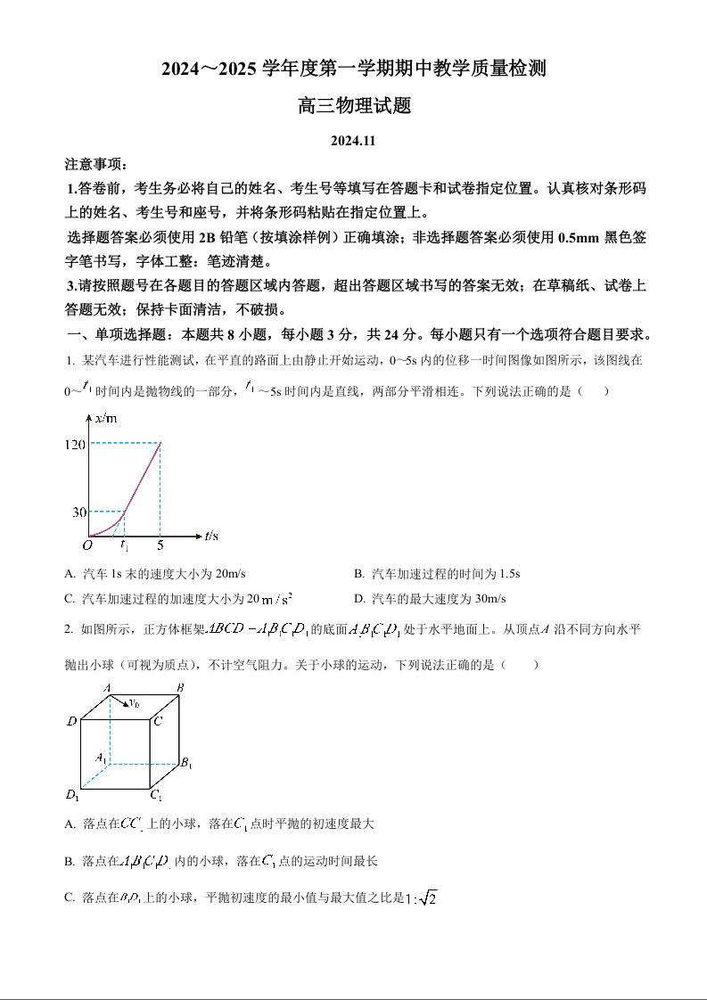 山东省济宁市2024-2025学年高三上学期期中考试 物理