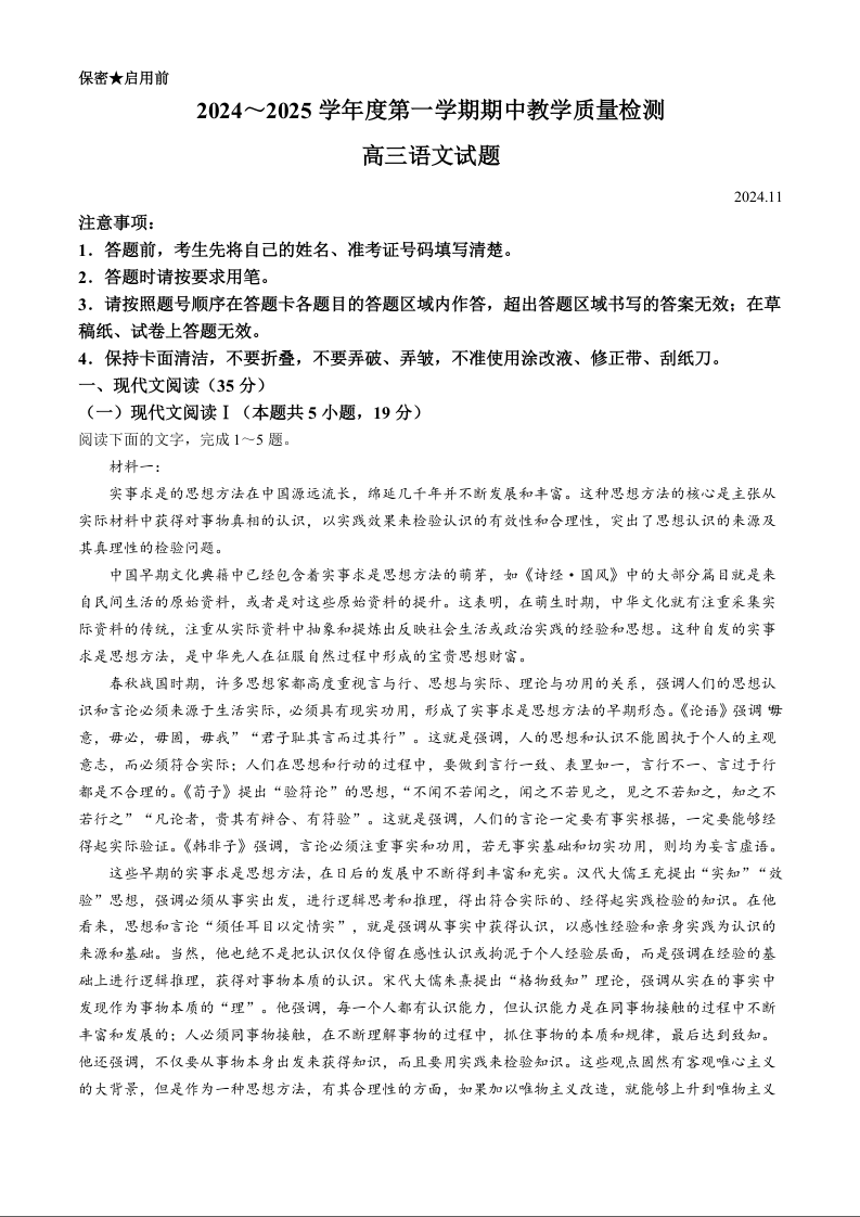 山东省济宁市2024-2025学年高三上学期期中考试 语文