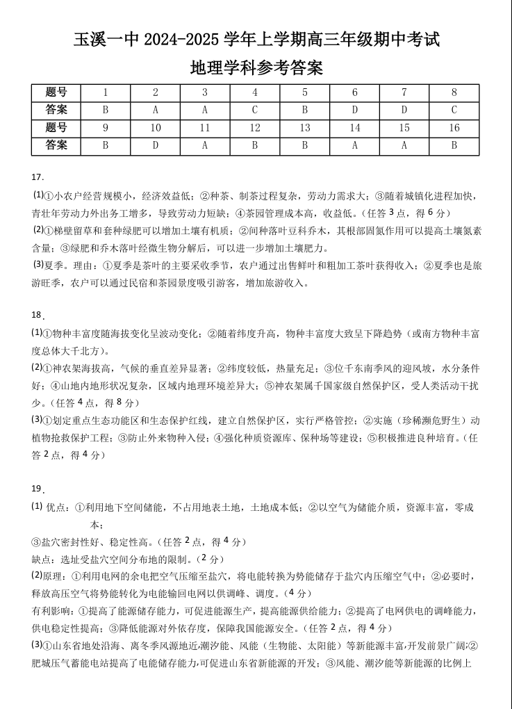 玉溪一中2024-2025学年上学期高三年级期中考试 地理答案