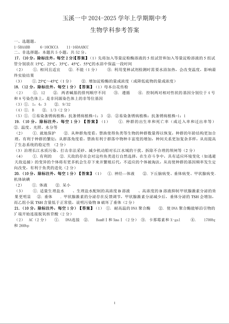 玉溪一中2024-2025学年上学期高三年级期中考试 生物答案