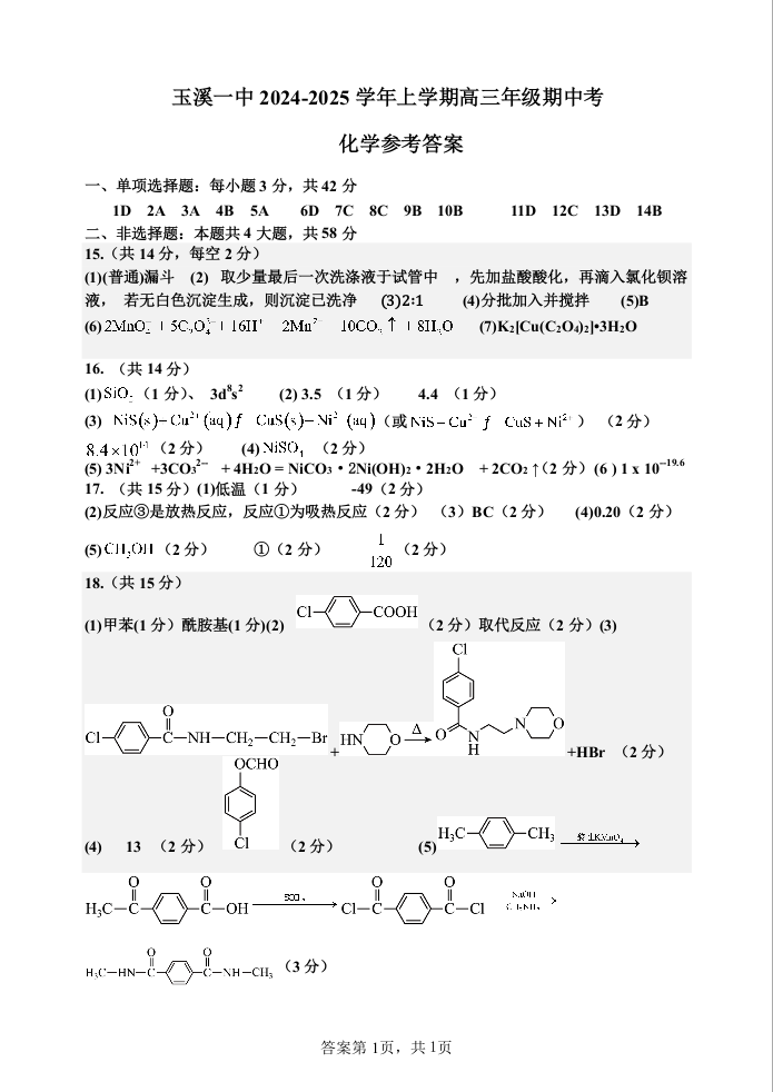 玉溪一中2024-2025学年上学期高三年级期中考试 化学答案