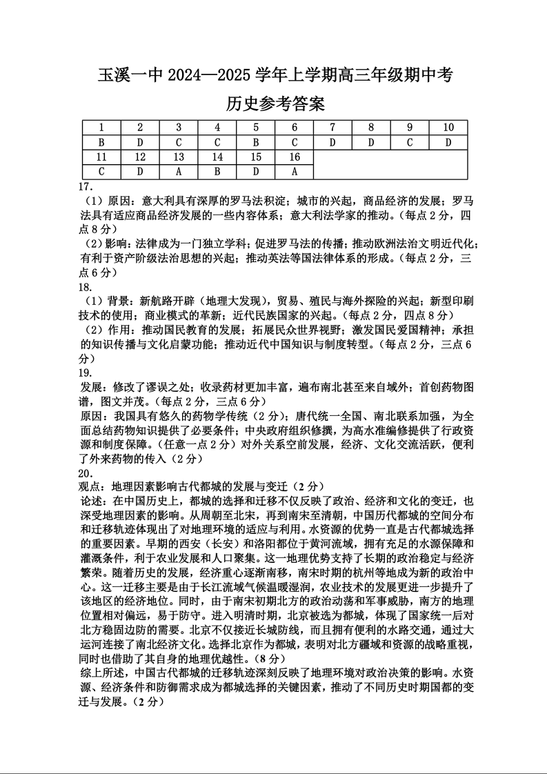 玉溪一中2024-2025学年上学期高三年级期中考试 历史答案