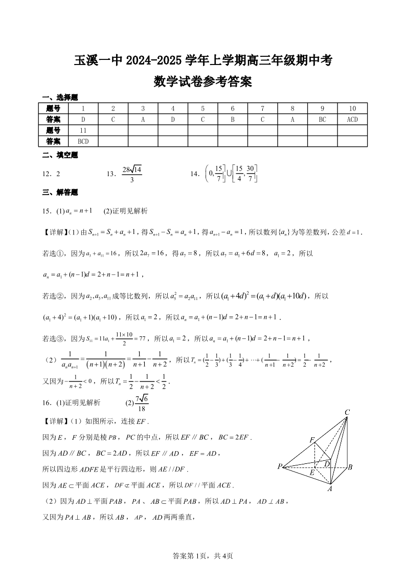 玉溪一中2024-2025学年上学期高三年级期中考试 数学答案