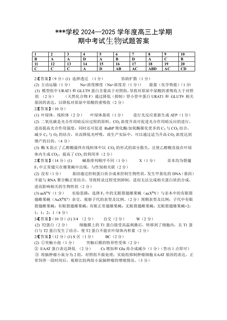 黑龙江省哈师大附中2025届高三上学期期中考试 生物答案