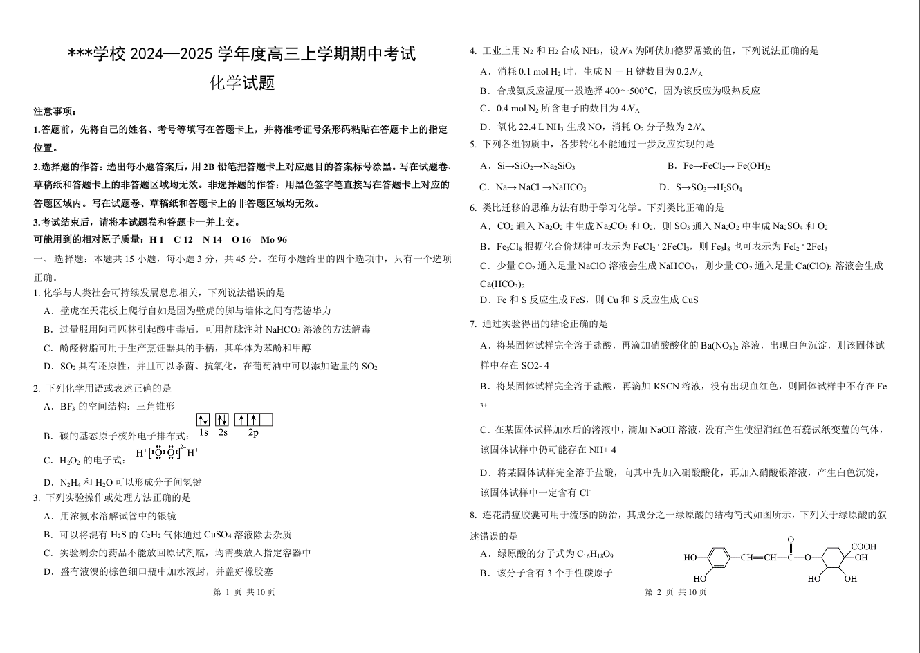 黑龙江省哈师大附中2025届高三上学期期中考试 化学