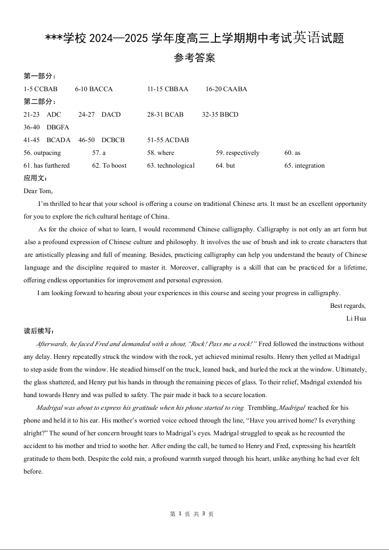 黑龙江省哈师大附中2025届高三上学期期中考试 英语答案