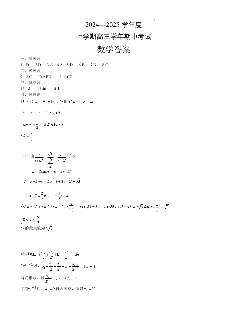 黑龙江省哈师大附中2025届高三上学期期中考试 数学答案