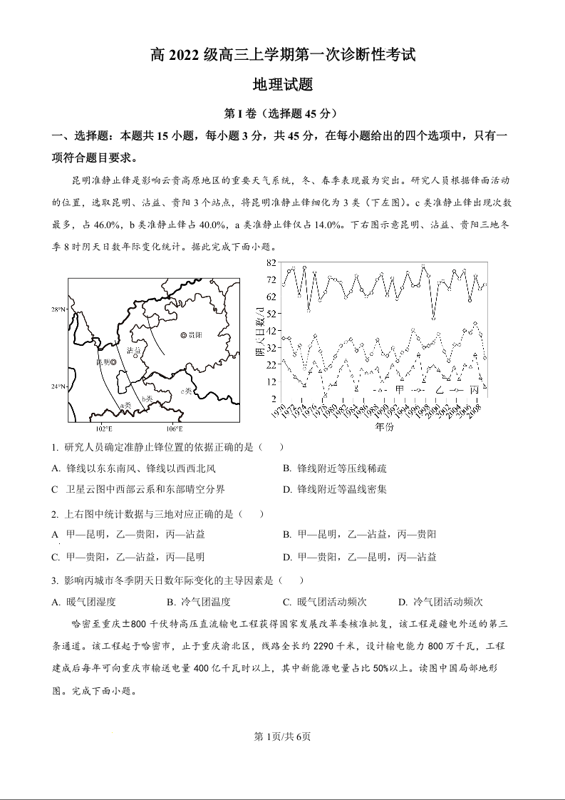 四川省宜宾市叙州区高2022级高三上学期第一次诊断性考试 地理