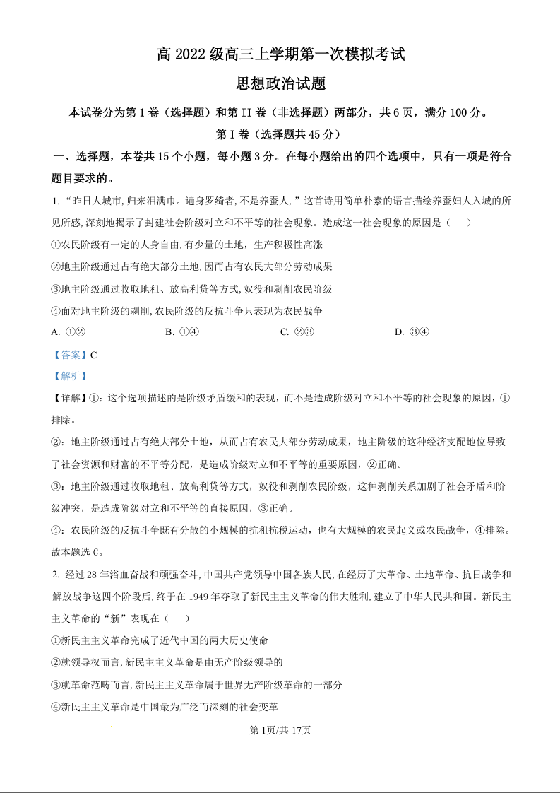 四川省宜宾市叙州区高2022级高三上学期第一次诊断性考试 政治答案