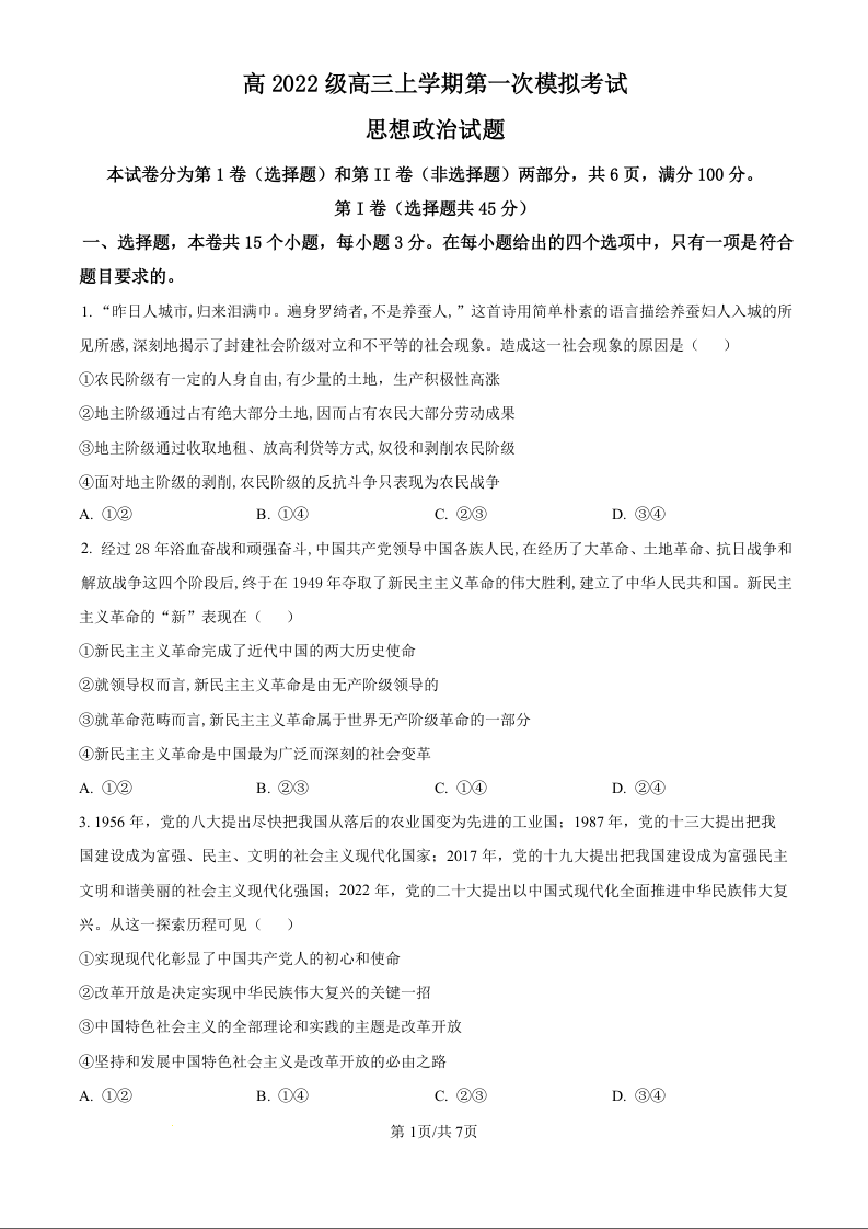 四川省宜宾市叙州区高2022级高三上学期第一次诊断性考试 政治