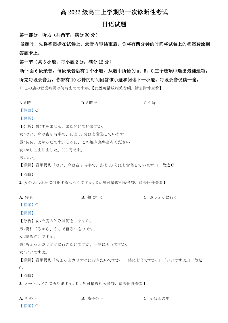 四川省宜宾市叙州区高2022级高三上学期第一次诊断性考试 日语答案