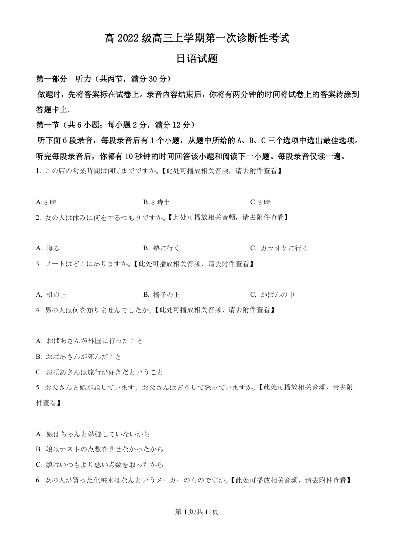 四川省宜宾市叙州区高2022级高三上学期第一次诊断性考试 日语