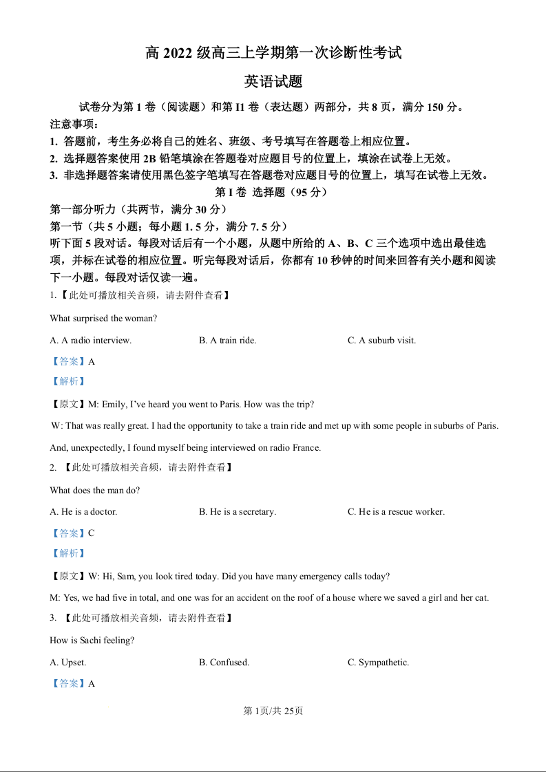 四川省宜宾市叙州区高2022级高三上学期第一次诊断性考试 英语答案
