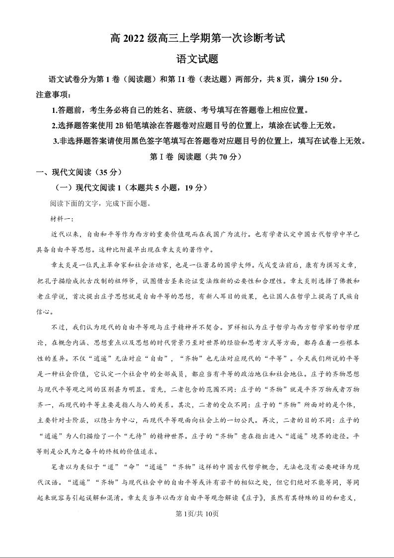 四川省宜宾市叙州区高2022级高三上学期第一次诊断性考试 语文