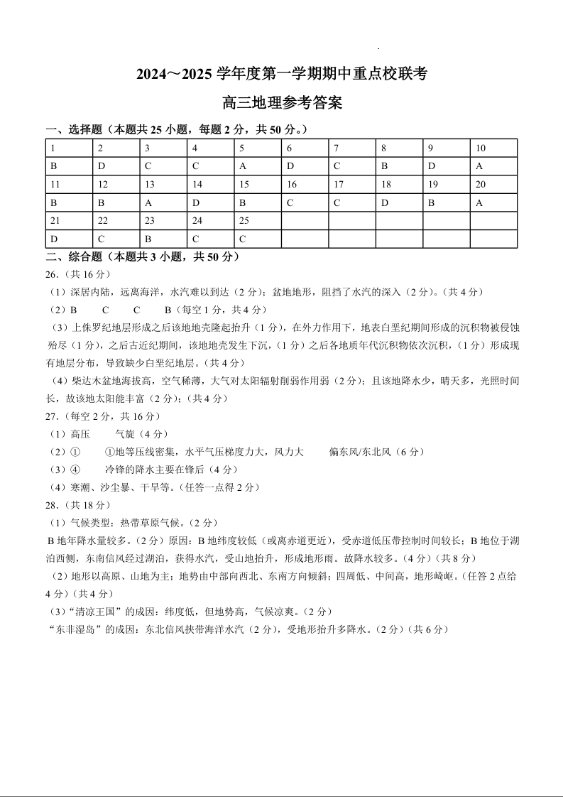 天津市五区县重点校联考2025届高三上学期11月期中考试 地理答案