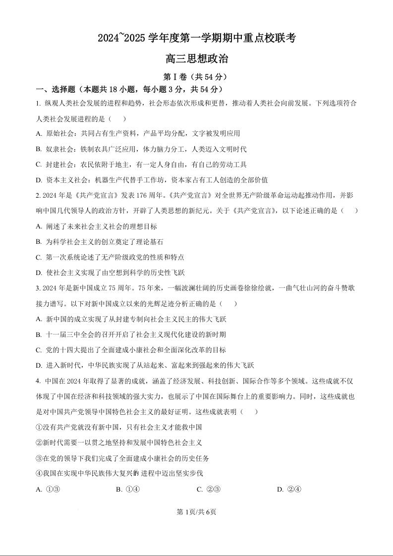 天津市五区县重点校联考2025届高三上学期11月期中考试 政治