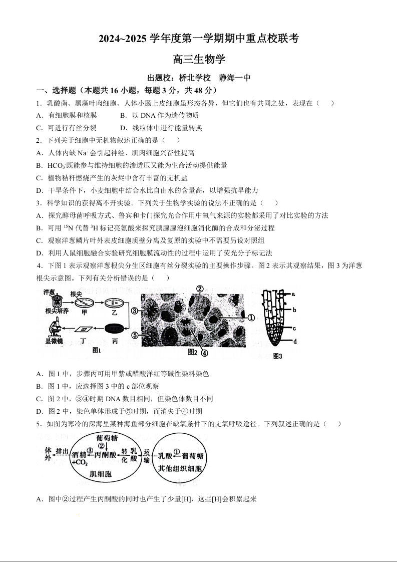 天津市五区县重点校联考2025届高三上学期11月期中考试 生物