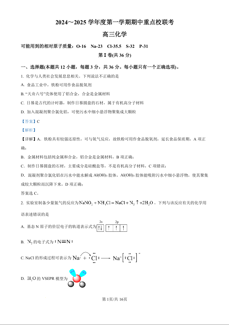 天津市五区县重点校联考2025届高三上学期11月期中考试 化学答案