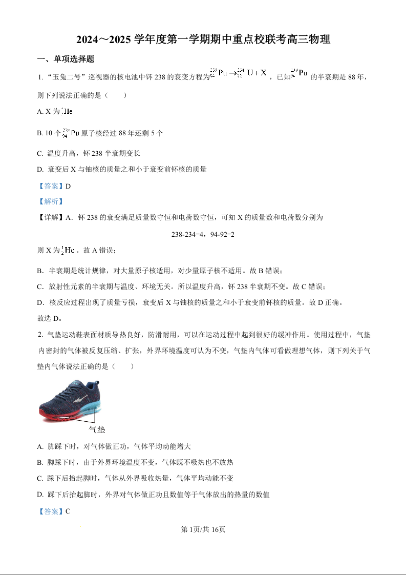 天津市五区县重点校联考2025届高三上学期11月期中考试 物理答案