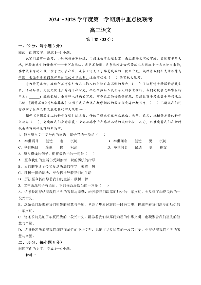 天津市五区县重点校联考2025届高三上学期11月期中考试 语文