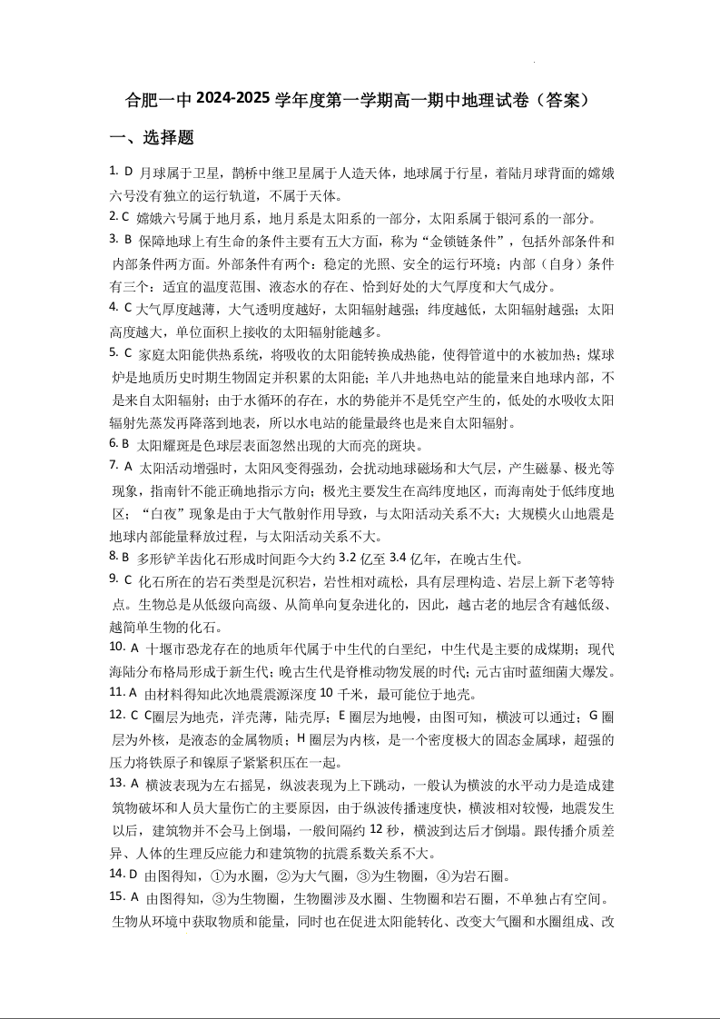安徽省合肥市第一中学2024-2025学年高一上学期期中联考 地理答案
