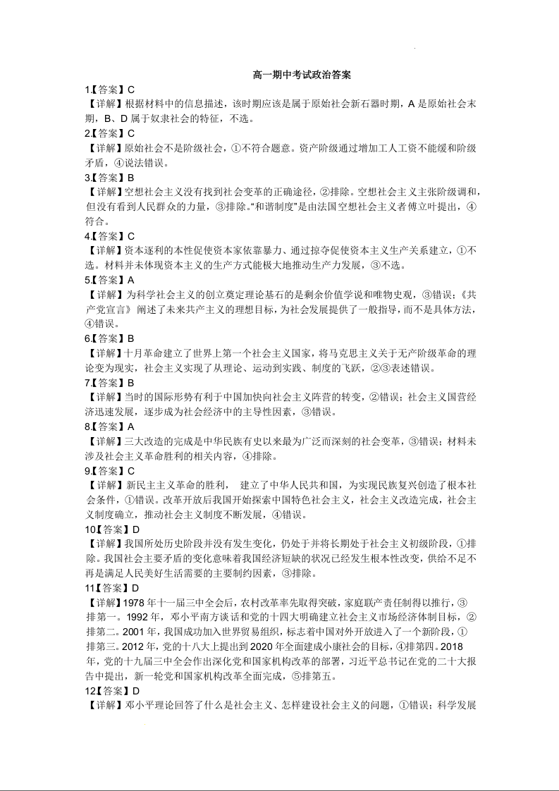 安徽省合肥市第一中学2024-2025学年高一上学期期中联考 政治答案