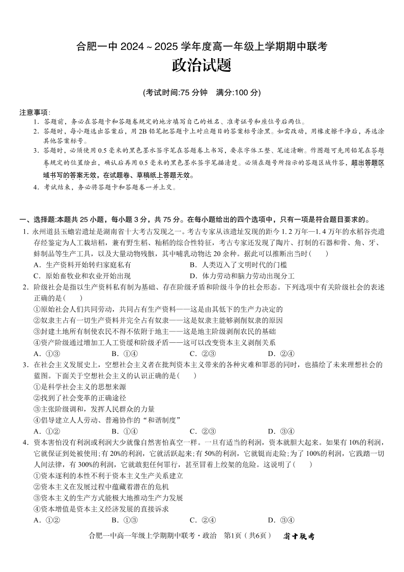 安徽省合肥市第一中学2024-2025学年高一上学期期中联考 政治