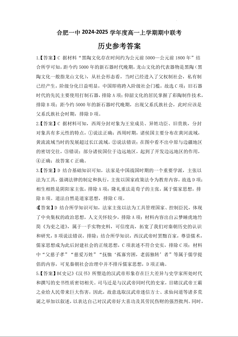 安徽省合肥市第一中学2024-2025学年高一上学期期中联考 历史答案