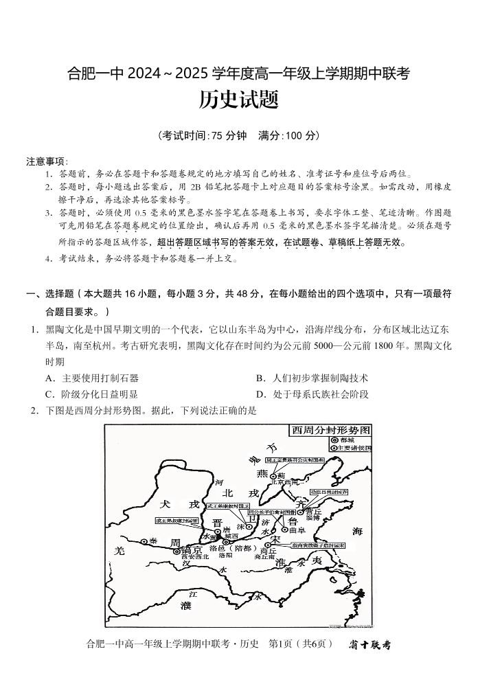 安徽省合肥市第一中学2024-2025学年高一上学期期中联考 历史