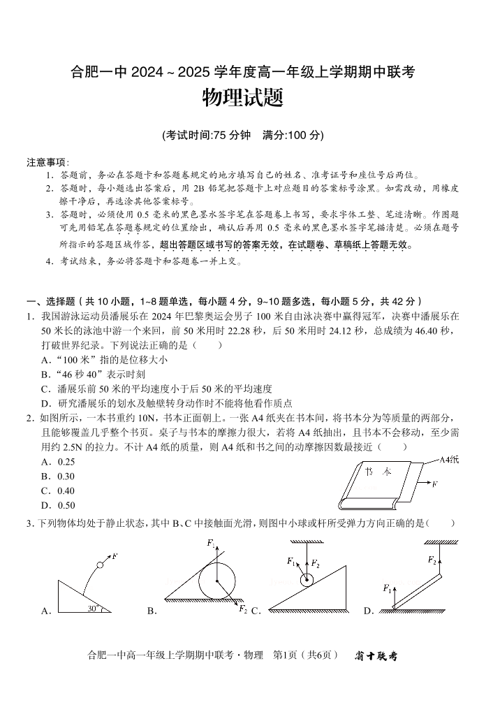 安徽省合肥市第一中学2024-2025学年高一上学期期中联考 物理