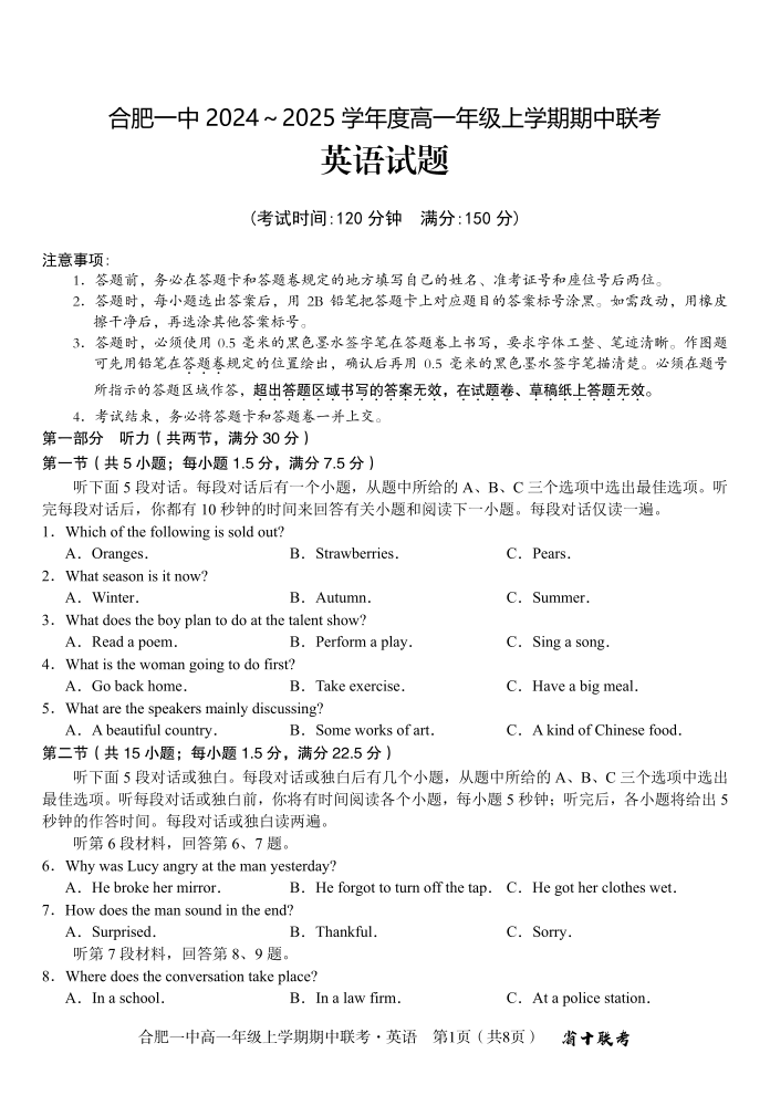 安徽省合肥市第一中学2024-2025学年高一上学期期中联考 英语