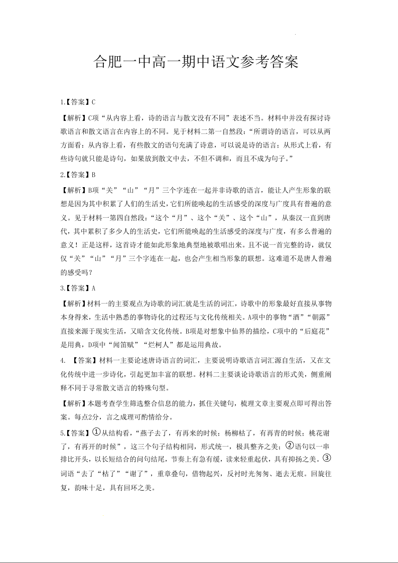 安徽省合肥市第一中学2024-2025学年高一上学期期中联考 语文答案