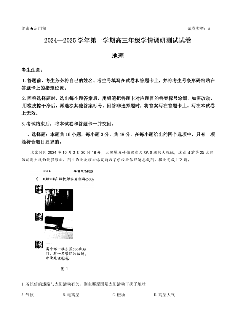 山西2024-2025 学年第一学期高三年级学情调研测试 地理