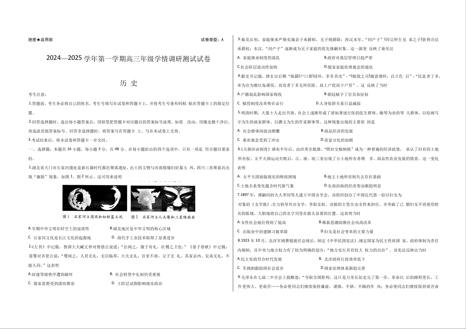山西2024-2025 学年第一学期高三年级学情调研测试 历史